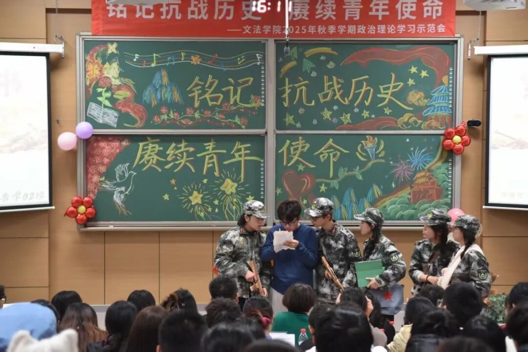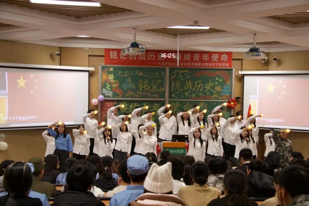 为深入贯彻落实党的二十大和二十届四中全会精神,进一步激发青年学生的爱国主义情怀,鼓励新时代青年挺膺担当,躬身入局,必威betway西汉姆联团委联合大学生理论指导中心于10月29日下午在锦绣楼T301开展了以“铭记抗战历史,赓续青年使命”为主题的政治理论学习示范会。