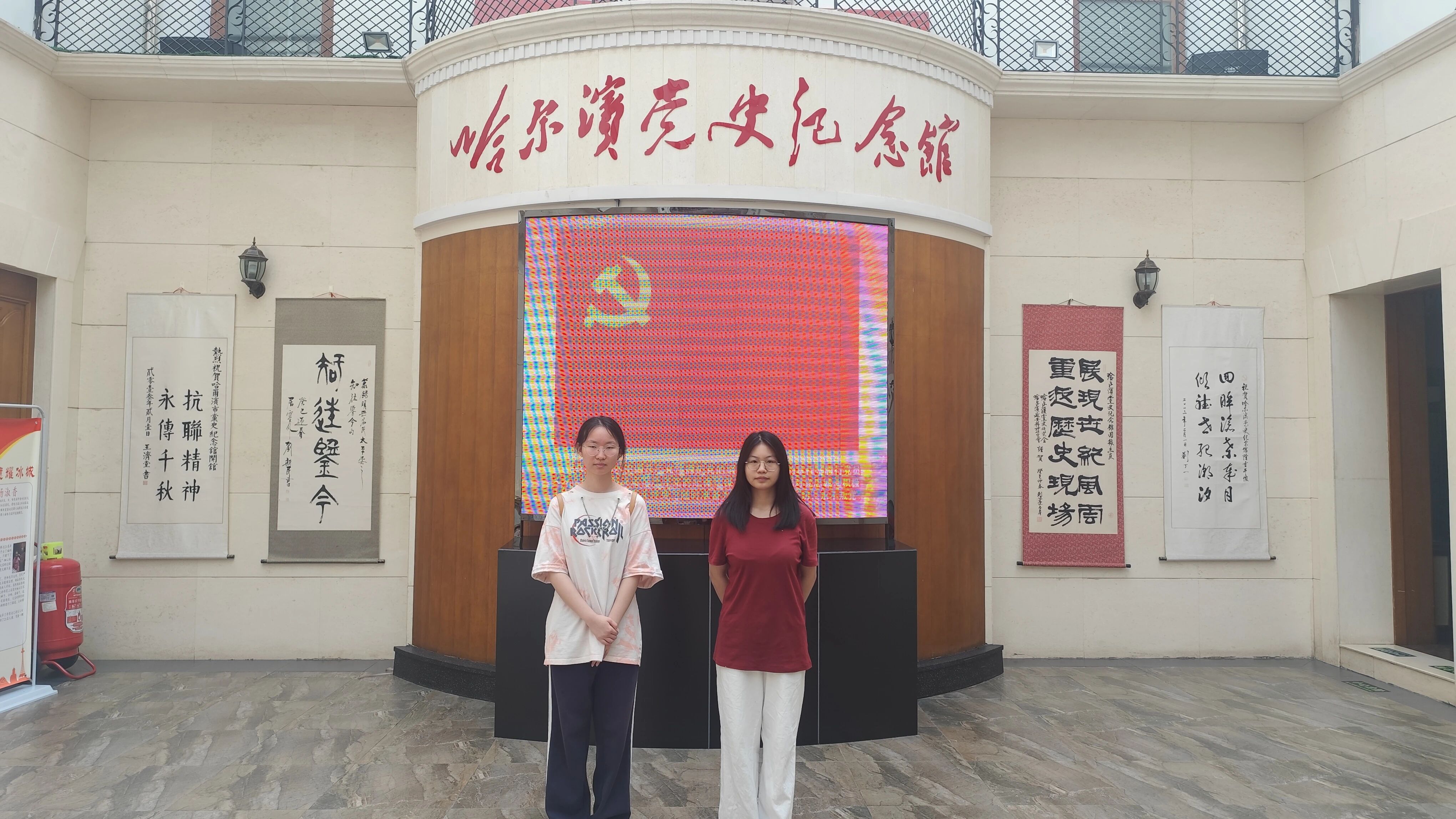 纪念馆内,两位同学并肩而立。背后屏幕上的党旗,鲜艳夺目。这里承载着城市的红色记忆,“抗战精神永传千秋” 的墨宝,诉说着使命。我们在此寻访党史,让红色薪火融入青春,以实践践行信仰,传承先辈热血,续写时代华章 。