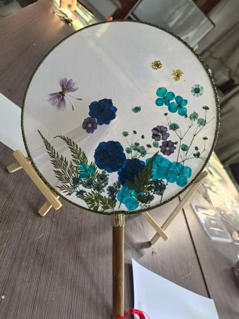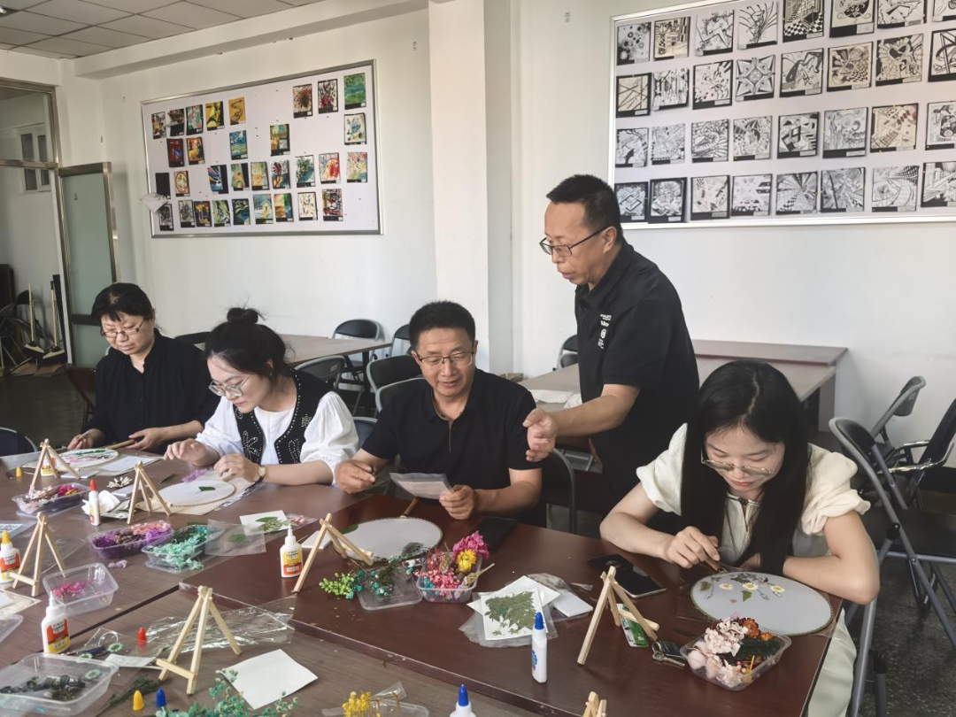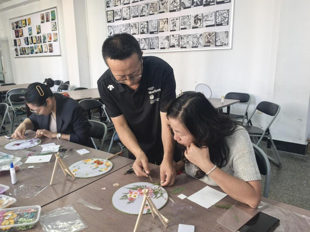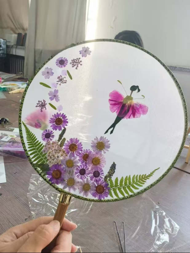 活动邀请了家居学院的高飞老师为老师们讲解压花工艺的相关知识,高老师首先就如何发现美、如何创造美,给老师们上了一堂精彩的艺术修养课,随后手把手教老师们花瓣摆放、构图技巧,制作过程中老师们进一步的领悟到如何用色彩呼应传递心意,怎样借花材形态表达祝福,手中的团扇不再只是摆件,成了能传递情感的艺术品,更显珍贵。