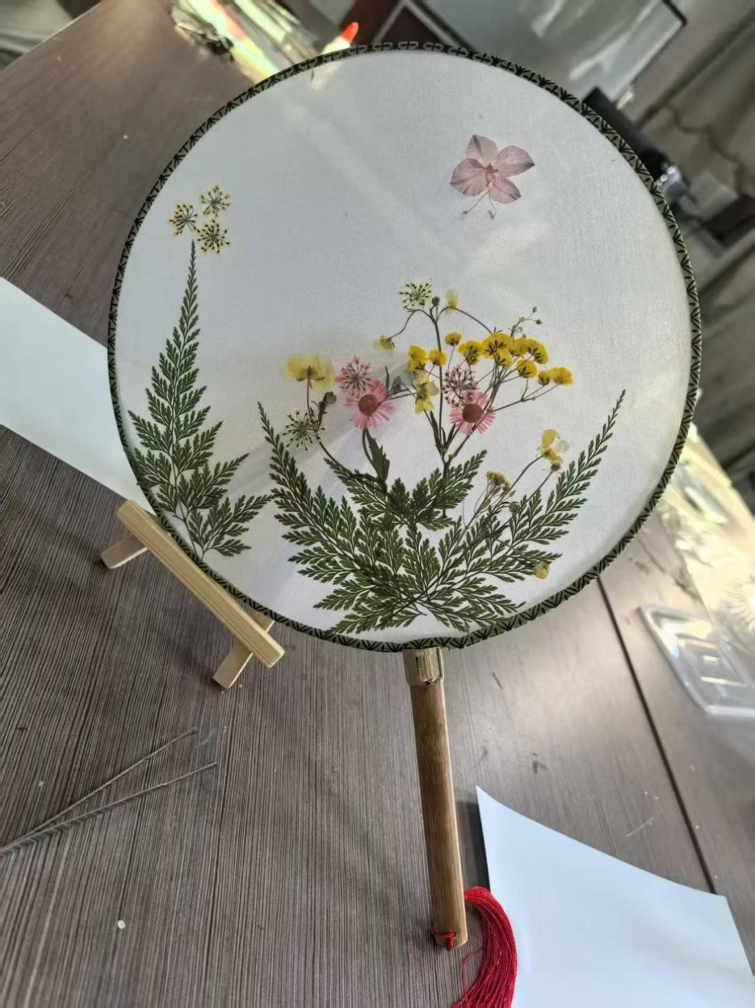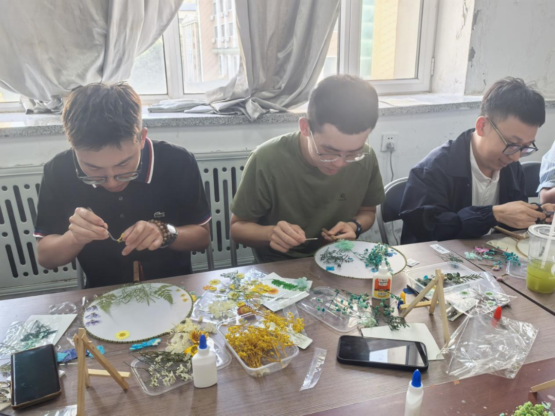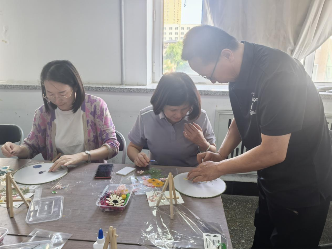 活动邀请了家居学院的高飞老师为老师们讲解压花工艺的相关知识,高老师首先就如何发现美、如何创造美,给老师们上了一堂精彩的艺术修养课,随后手把手教老师们花瓣摆放、构图技巧,制作过程中老师们进一步的领悟到如何用色彩呼应传递心意,怎样借花材形态表达祝福,手中的团扇不再只是摆件,成了能传递情感的艺术品,更显珍贵。